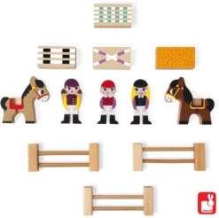 Holzspielzeug. Figuren aus Buchenholz. Spielset mit unterschiedlichen Figuren in 1 Box. Trainiere Dein Pferd zum Springreiten oder steige auf, um auszureiten. Enthält 3 Reiter, 2 Pferde, 1 Strohballen, 3 Hindernisse, 3 Barrieren. 12 Teile aus Massivholz (Buche). Heißtransferdruck. Kartonverpackung.