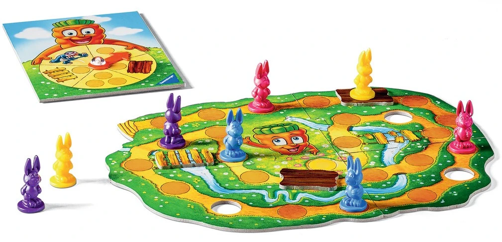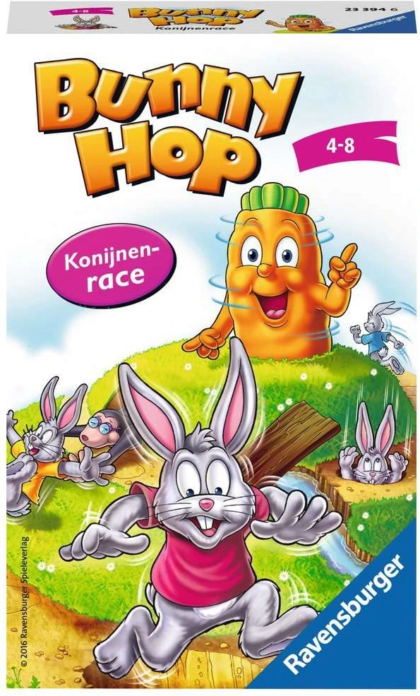 Ravensburger Bunny Hop. Genre: Rennen-Brettspiel, Spielzeit (max.): 15 min, Zielgruppe: Kinder. Verpackungsbreite: 120 mm, Verpackungstiefe: 180 mm, Verpackungshöhe: 40 mm. Anzahl Teile: 13 Stück(e), Anzahl der Spielzeugfiguren: 8 Stück(e)